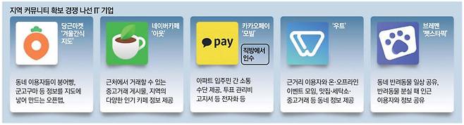 네이버, 카카오, 구글 등 거대 기업도 동네 시장 공략에 힘을 쏟고 있다. 3사가 모두 제공하는 지도 서비스는 단순히 위치를 안내하는 것에서 각종 지역 정보를 담고 리뷰로 소통하는 지역 SNS로 진화하고 있다. 지난해 포항의 소상공인이 개발한 메뉴 '덮죽'이 도용당하는 사건이 벌어지자 대중이 지도 서비스로 몰려가 도용한 점포에 비난 댓글을 단 것이 대표적이다. 또 네이버는 지역 커뮤니티 원조 격인 네이버카페의 지역 기반 서비스를 강화하고 있다. 네이버카페가 지난해 12월 24일 선보인 '이웃'은 이용자에게 주변에서 인기 있는 게시물, 인근 중고거래 게시물, 인기 있는 지역 기반 카페 등을 보여준다. 카카오의 테크핀 자회사 카카오페이가 2018년 말 인수한 아파트 커뮤니티 '모빌'은 입주민에게 전자투표, 전자결재, 전자관리비고지서, 디지털음성방송, 아파트 시설물 예약 등 서비스를 제공한다. 부동산 정보 앱과 카카오의 다음 부동산을 운영하고 있는 직방은 최근 카카오페이로부터 모빌을 인수해 부동산과 지역 커뮤니티를 결합해 시너지를 낼 예정이다.