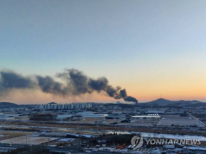 (고양=연합뉴스) 7일 오후 경기 고양시 일산동구 설문동의 한 가구공장에서 불이 나 인접한 파주시에서도 검은 연기가 관측되고 있다. 2021.1.7 [독자 제공. 재판매 및 DB금지]