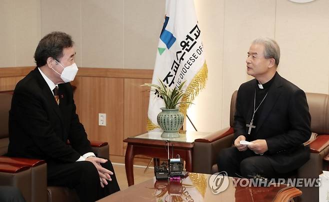 (수원=연합뉴스) 홍기원 기자 = 더불어민주당 이낙연 대표가 7일 오후 경기도 수원시 장안구 천주교 수원교구청에서 이용훈 한국천주교주교회의 의장과 대화를 나누고 있다. 2021.1.7
