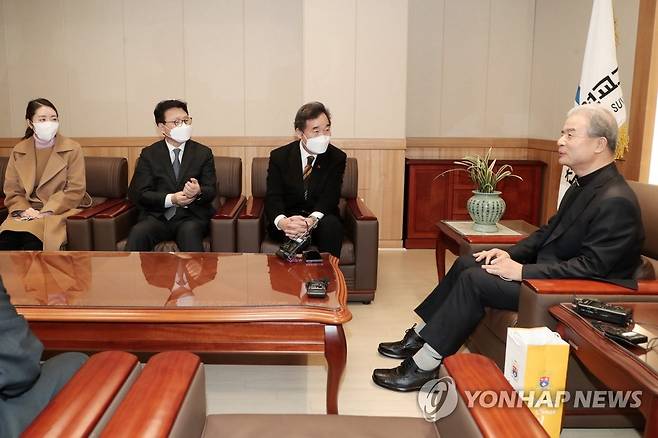 (수원=연합뉴스) 홍기원 기자 = 더불어민주당 이낙연 대표가 7일 오후 경기도 수원시 장안구 천주교 수원교구청에서 이용훈 한국천주교주교회의 의장과 대화하고 있다. 2021.1.7