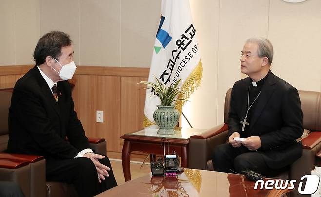 (수원=뉴스1) 조태형 기자 = 이낙연 더불어민주당 대표(왼쪽)가 7일 오후 경기도 수원시 장안구 천주교 수원교구청을 방문해 이용훈 한국천주교주교회의 의장과 대화를 나누고 있다. 2021.1.7/뉴스1
