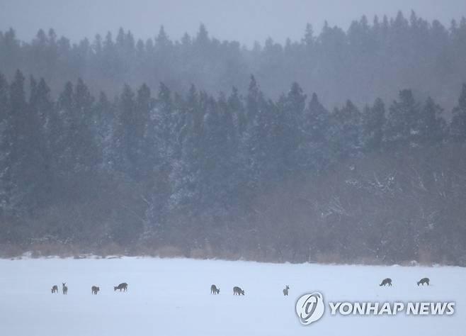 (서귀포=연합뉴스) 박지호 기자 = 제주도에 폭설이 내린 7일 오후 서귀포시 중산간의 한 목장에서 노루들이 먹이를 찾고 있다. 2021.1.7