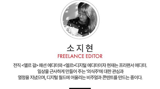 안녕하세요. 저는 패션 하우스의 PR을 담당하고 있는 이윤아입니다. 요즘 제가 좀 더 집중하고자 하는 건 나의 온전함과 긍정적인 기운 그리고 내 주변 사람들과의 소통, 케미예요. '취향'이 닮은 친구들과 사적인 시간을 함께하고, 호흡을 같이하며 서로 올바른 길로 갈 수 있도록 인도해주는 것. 제가 제일 좋아하고 집중하는 일이에요.