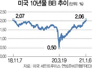 7일 미국 세인트루이스 연방준비은행 경제통계(FRED)에 따르면 지난 6일(현지 시간) 미국 10년물 손익 분기 물가 상승률(BEI)은 2.06%로 집계됐다. 2018년 11월 8일(2.07%) 이후 최고치다. 4일에는 2.01%로 나타나 약 26개월 만에 처음으로 2%를 웃돌았다. 미국 연방준비제도(Fed·연준)가 기준 금리 상승 척도로 ‘물가 상승률 2%’를 두고 있다는 점에서 시사점이 크다는 해석이다. 우리나라에서도 5일 BEI가 1.04%로 집계돼 2019년 6월 이후 처음으로 1%를 넘겼다.