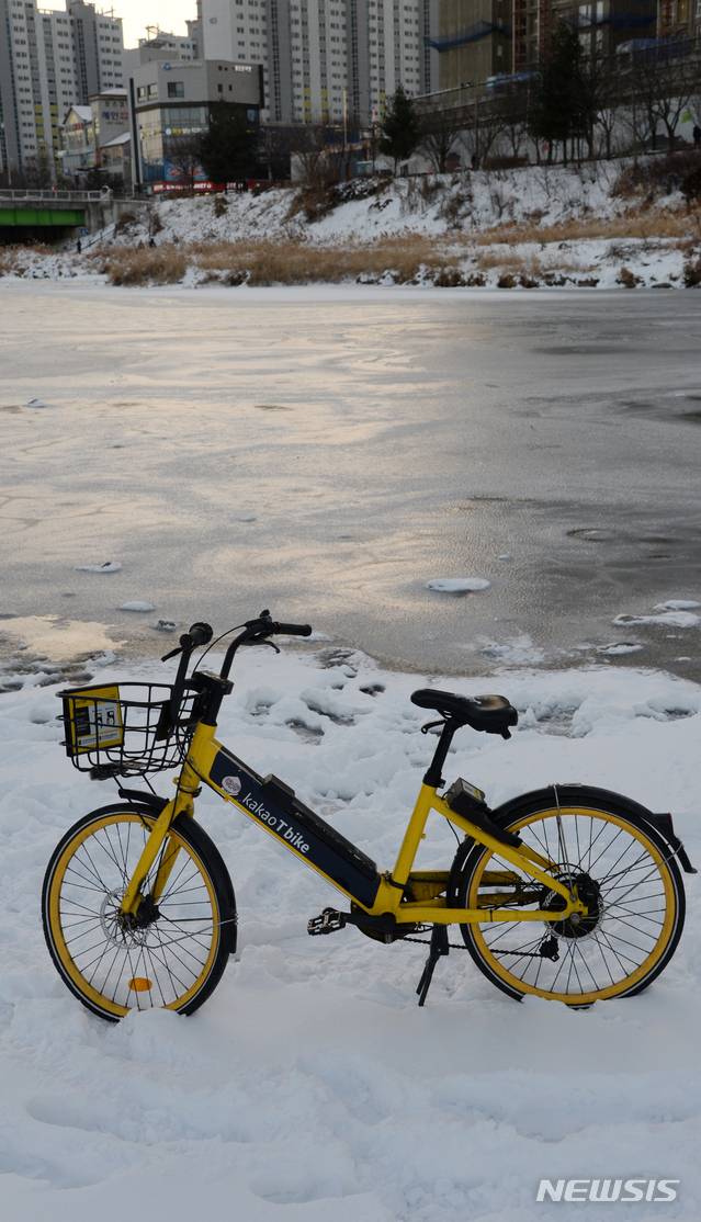 [전주=뉴시스] 김얼 기자 = 폭설과 더불어 영하권의 날씨가 이어지고 있는 7일 전북 전주시 완산구 삼천천이 얼어붙어 생긴 빙판에 공공자전거가 세워져 있다. 2021.01.07.