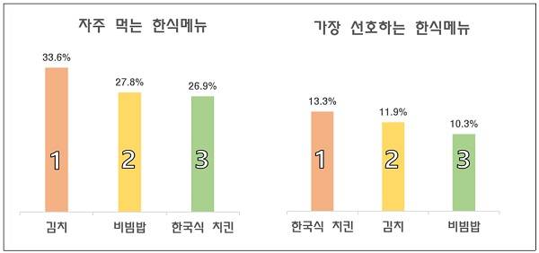 해외에서 가장 자주 먹는 한식은 ‘김치’이고 가장 좋아하는 음식은 ‘한국식 치킨’인 것으로 나타났다.