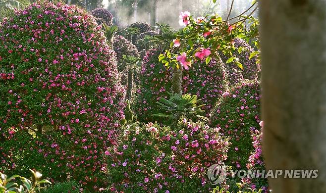 (서귀포=연합뉴스) 전수영 기자 = 제주 서귀포시 남원읍에 있는 위미리 동백군락지에는 제주동백수목원이 있다. 1만㎡가량의 땅에 애기동백 500여 그루가 심겨 있다. 이른 아침 수목원에 거대한 솜사탕처럼 둥글게 다듬은 애기동백 나무들이 진분홍빛 꽃을 단 채 빽빽하게 늘어서 있다. 애기동백은 토종동백보다 훨씬 더 빨리 자라는 데다 꽃도 더 화려하게 피어 조경용으로 인기를 얻고 있다. 여러 장의 꽃잎을 활짝 열어젖힌 채 나무를 온통 진홍빛으로 뒤덮으면서 화려함을 뽐낸다. 2021.1.7