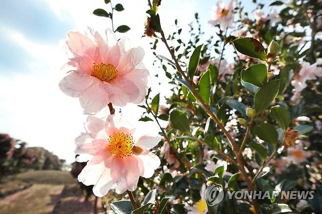 (서귀포=연합뉴스) 전수영 기자 = 제주 서귀포시 남원읍에 있는 위미리 동백군락지에는 수령 100년을 넘긴 거대한 토종동백 나무들이 돌담을 따라 늘어서 있다. 안쪽의 애기동백 나무는 군락지를 조성한 현맹춘 할머니의 증손자 오덕성 씨가 심은 것이다. 연분홍빛 애기동백이 화사함을 뽐내고 있다. 2021.1.7
