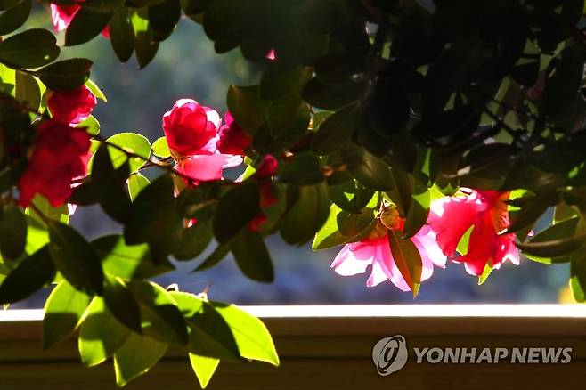 (서귀포=연합뉴스) 전수영 기자 = 제주 서귀포시 남원읍에 있는 위미리 동백군락지에는 제주동백수목원이 있다. 1만㎡가량의 땅에 애기동백 500여 그루가 심겨 있다. 이른 아침 수목원에 거대한 솜사탕처럼 둥글게 다듬은 애기동백 나무들이 진분홍빛 꽃을 단 채 빽빽하게 늘어서 있다. 애기동백은 토종동백보다 훨씬 더 빨리 자라는 데다 꽃도 더 화려하게 피어 조경용으로 인기를 얻고 있다. 여러 장의 꽃잎을 활짝 열어젖힌 채 나무를 온통 진홍빛으로 뒤덮으면서 화려함을 뽐낸다. 2021.1.7