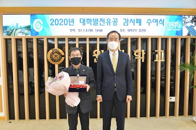 ‘2020년 대학발전 유공자 포상식’의 일환으로 열린 감사패 전달식은 지난해 대학의 발전 및 대학과의 산학협력 활동에 기여한 바가 큰 외부인사에게 대학 구성원의 감사의 뜻을 전하기 위해 마련됐다.