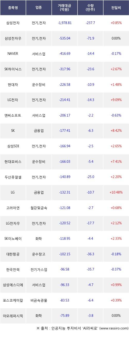 외국인 투자자의 순매도 상위 20개 종목은 삼성전자, 삼성전자우, NAVER, SK하이닉스, 현대차, LG전자, 엔씨소프트, SK, 삼성SDI, 현대모비스등이다.