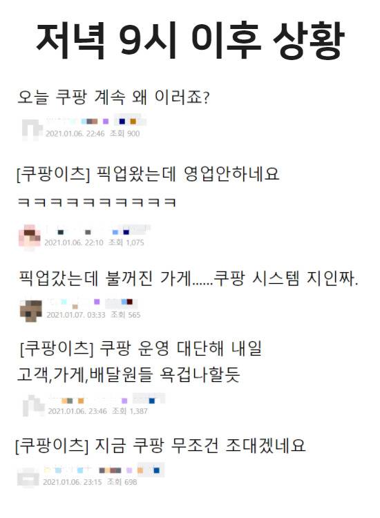 하지만 쿠팡이츠는 오후 10시가 넘어서야 서울 강남, 서초 등 배달이 몰리는 일부 지역을 시작으로 주문 접수를 중단했다.
