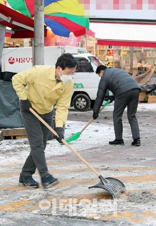 [이데일리 김태형 기자] 채현일 영등포구청장이 7일 당산1동 일대의 폭설로 인한 출근길 교통불편 최소화를 위해 긴급 제설작업을 하고 있다.