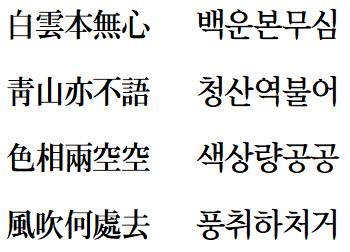 흰 구름은 정처없이 무애(無碍)이면서 공(空)을 의미한다. 청산은 물성을 띤 색(色)의 세계다. 그러나 둘 다 파고들면 실체가 없다. 바람과도 같다. 불교의 색즉시공 공즉시색의 묘법을 읊었다. 그림을 보고 쓴 제화시(題畵詩)로 조선 중기 문신이자 학자 이수광(李수(돌 수)光 1563~1628)이 지었다.