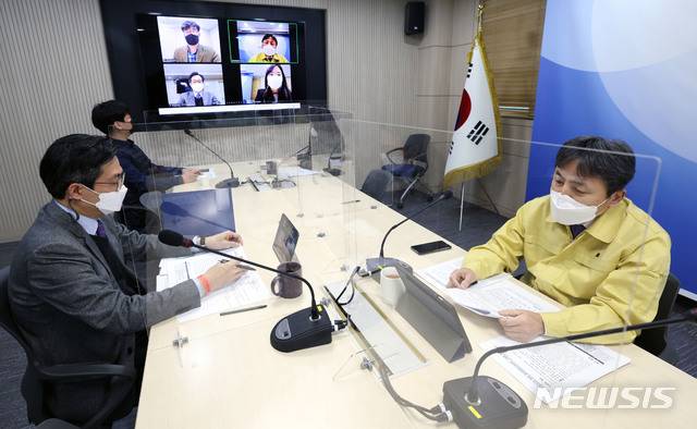 [서울=뉴시스]김정배 문화체육관광부 제2차관이 7일 서울 용산구 문체부 스마트워크센터 회의실에서 화상을 통해 실내체육시설업계 협·단체장과 간담회를 갖고 코로나19 관련 세부방역지침을 논의하고 업계 의견을 청취하고 있다. (사진=문화체육관광부 제공) 2021.01.07. photo@newsis.com