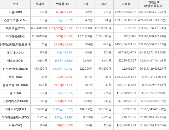 또한, 시빅(41.53%, 167원), 스트라티스(23.34%, 909원), 리플(21.74%, 336원), 스테이터스네트워크토큰(20.83%, 76원), 트론(3.55%, 35원), 이더리움(0.04%, 1,338,000원)이 상승세를 나타냈다.