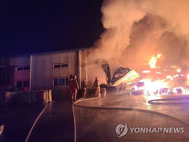 (고양=연합뉴스) 7일 오후 경기 고양시 일산동구 설문동의 한 가구공장에서 불이 나 건물이 화염에 휩싸여 있다. 2021.1.7 [일산소방서 제공. 재판매 및 DB금지]