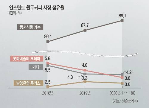 시장이 커지고 경쟁이 격해지면 제품의 품질은 좋아지기 마련이다. 맥심 모카골드로 우리나라 인스턴트커피 시장을 평정한 동서식품이 인스턴트 원두커피 카누를 내놓게 된 것은 커피 시장의 몸집이 커진 것과 무관치 않다. 2000년대 후반부터 커피전문점의 아메리카노가 20~30대를 중심으로 크게 인기를 끌었고 커피 시장도 다양해져 갔다. 동서식품은 여기에 주목해 ‘커피전문점 아메리카노 수준의 맛과 향을 내는 제품’을 만들기 위해 연구·개발에 들어갔다.
