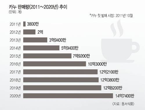 2011년 10월 세상에 처음 등장한 ‘카누’는 우리나라에서 ‘인스턴트 원두커피’라는 새로운 카테고리를 만들어냈다. 스틱 형태로 포장돼 있어 물만 부으면 간단하게 원두커피를 즐길 수 있는 방법이 카누의 개발로 대중화됐다. ‘세상에서 가장 작은 카페’라는 슬로건은 소비자들에게 제대로 통했다. 출시 첫해에 3800만잔을 팔았고, 판매량은 2년 뒤인 2013년(3억9400만잔) 10배 이상 성장했다. 2016년(10억3000만잔) 처음으로 10억잔을 돌파했고 지난해 판매량은 사상 최대치를 기록했다.