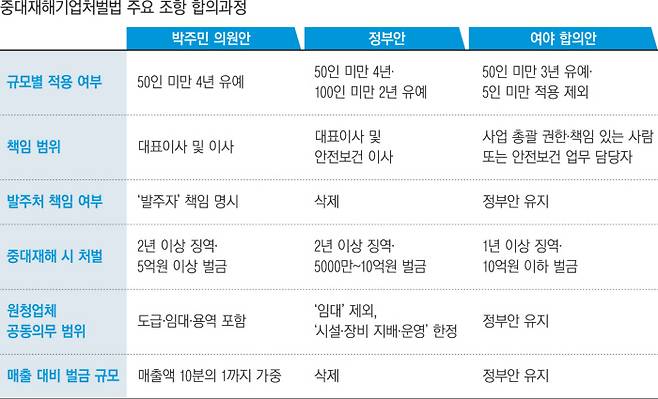 여야는 이날 논의에서 마지막 쟁점이던 법 적용 유예 부칙은 ‘50인 미만 사업장에 대해 공포 후 3년’으로 합의했다. 원안의 ‘4년 유예’에서 1년 당겼다. 정부 측에서 제시한 50~99인 사업장 ‘2년 유예’ 의견은 폐기했다. 5인 미만 사업장이 법 적용 대상에서 제외되는 등 전반적인 법안 내용이 대폭 후퇴한 상황에서 유예 기간을 그대로 유지할 명분이 사라진 결과다. 그러나 전국 전체 사업장 가운데 98.8%가 50인 미만 사업장이고, 전체 재해 76.6%가 영세 사업장에서 발생하는 상황에서 3년 유예 역시 지나치다는 지적이 나온다.