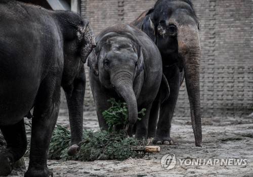 epa08924308 Asian Elephants eat Christmas trees in their enclosure in the Tierpark Zoo, in Berlin, Germany, 07 January 2021. The Zoo uses leftover Christmas trees to feed animals after Christmas. EPA/FILIP SINGER