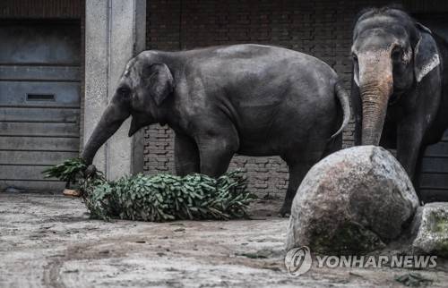 epa08924312 Asian Elephants eat Christmas trees in their enclosure in the Tierpark Zoo, in Berlin, Germany, 07 January 2021. The Zoo uses leftover Christmas trees to feed animals after Christmas. EPA/FILIP SINGER