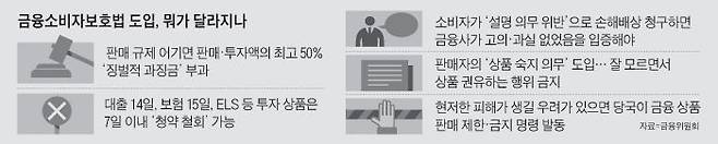 금소법 시행에 따라 앞으로 은행, 증권사 등 금융 상품 판매사들은 판매 규제를 어기고 상품을 팔면 전체 판매액 또는 투자액의 최대 50%까지 ‘징벌적 과징금’을 내야 한다. DLF를 8000만원어치 팔았다가 문제가 됐다면 최대 4000만원까지 과징금을 내야 한다는 뜻이다. 또, 판매를 한 직원도 최대 1억원의 과태료를 물게 된다.
