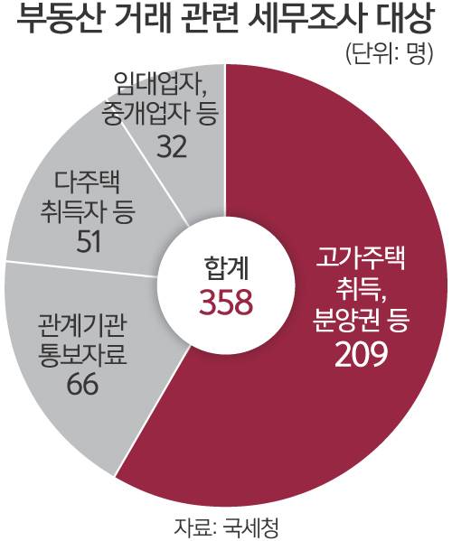 조사 대상에는 고가주택이나 상가를 취득하는 과정에서 분양권 다운계약이나 편법증여 등 탈루혐의가 있는 209명, 다수 주택을 취득하고도 뚜렷한 신고소득이 확인되지 않아 편법으로 증여받은 혐의가 있는 51명이 포함됐다. 또 주택을 불법개조(방 쪼개기)해 임대한 뒤 현금 매출을 누락한 임대사업자와 현금 매출 누락 중개업소, 법인자금을 유출해 주택을 취득한 사주 일가 등 32명, 국토교통부 등 관계기관이 통보한 탈루혐의자 66명도 조사를 받게 됐다.