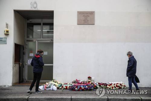 epa08924572 People stand near flowers and tributes for the victims outside the satirical newspaper Charlie Hebdo's former offices in Paris, France, 07 January 2021, on the sixth anniversary of the jihadist attack of the satirical magazine that killed 12 people. The attack on the weekly -- with its long history of mocking Islam and other religions -- was the first in a series of assaults that have claimed more than 250 lives since 07 January 2015, mostly at the hands of young French-born jihadists.