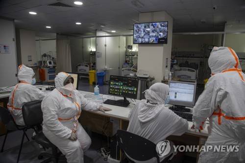 epa08924603 Healthcare staff and nurses watch over Covid-19 patients in the Covid-19 intensive care unit at Rafic Hariri University Hospital in Beirut, Lebanese, 07 January 2021. Lebanon started a 25-day long nationwide lockdown to battle a surge in coronavirus infections during the holiday season that has challenged the country's already battered health care sector. EPA/NABIL MOUNZER
