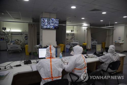 epa08924605 Healthcare staff and nurses watch over Covid-19 patients in the Covid-19 intensive care unit at Rafic Hariri University Hospital in Beirut, Lebanese, 07 January 2021. Lebanon started a 25-day long nationwide lockdown to battle a surge in coronavirus infections during the holiday season that has challenged the country's already battered health care sector. EPA/NABIL MOUNZER