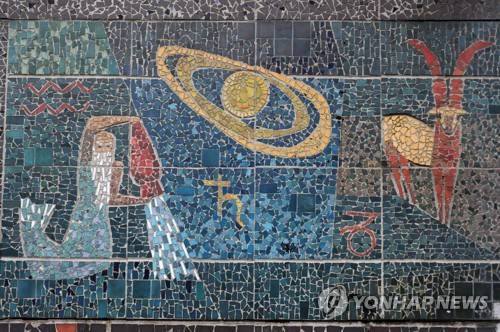 epa08924622 A more detailed view on a part of a mosaic by Domicella Bozekowska is seen on a building in Warsaw, Poland, 07 January 2021. The mosaic from the 1960s was reportedly listed in the register of monuments as a valuable relic of decorative arts in the area of Marysin Wawerski and an element of the history of the district. EPA/TOMASZ GZELL POLAND OUT