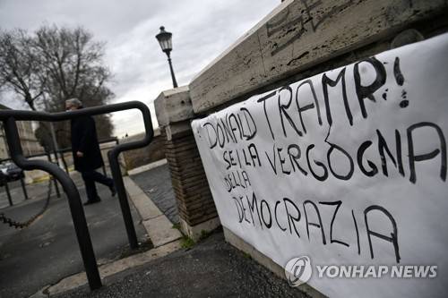 epa08924641 A view of a banner reading 'Donald Trump! You are a shame of democracy' at Ponte Sisto in Trastevere neighborhood in Rome, Italy, 07 January 2021. EPA/RICCARDO ANTIMIANI