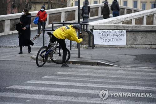 epa08924644 A view of a banner reading 'Donald Trump! You are a shame of democracy' at Ponte Sisto in Trastevere neighborhood in Rome, Italy, 07 January 2021. EPA/RICCARDO ANTIMIANI
