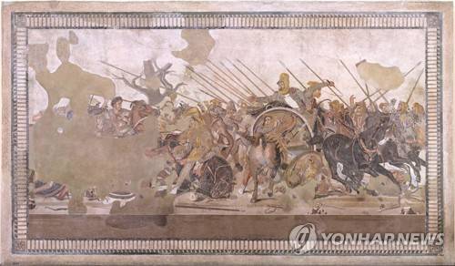 epa08924660 An undated handout photo made available by Pedicini, the Press Office of the National Archaeological Museum of Naples (MANN) on 07 January 2021 is described as showing the mosaic of the Isso Battle, fought between Alexander the Great and Dario of Persia, made by Alexander from Pompeii, during the beginning of the restoration works at the National Archaeological Museum of Naples) museum, in Naples, Italy. The restoration works are reportedly expected to end in July 2021. (ATTENTION EDITORS: Editorial use only in connection with reporting on the events depicted in the image) EPA/Pedicini / National Archaeological Museum of Naples / HANDOUT HANDOUT EDITORIAL USE ONLY/NO SALES/NO ARCHIVES