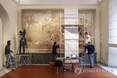 epa08924666 An undated handout photo made available by Pedicini, the Press Office of the National Archaeological Museum of Naples (MANN) on 07 January 2021 is described as showing experts during the beginning of the restoration works on the mosaic of the Isso Battle, fought between Alexander the Great and Dario of Persia, made by Alexander from Pompeii, at the National Archaeological Museum of Naples) museum, in Naples, Italy. The restoration works are reportedly expected to end in July 2021. (ATTENTION EDITORS: Editorial use only in connection with reporting on the events depicted in the image) EPA/Pedicini / National Archaeological Museum of Naples / HANDOUT HANDOUT EDITORIAL USE ONLY/NO SALES/NO ARCHIVES