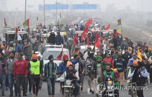 epa08924669 Indian farmers participate in the tractor rally to protest against the government's new agricultural laws at the Ghaziabad-Delhi border, Uttar Pradesh state, India, 07 January 2021. Thousands of farmers participated in the rally to mark their protests against the government's new agricultural laws and to demand for repealing the laws. Farmers have been stopped by the police at the various points outside Delhi border which are connected with neighboring states of Haryana and Uttar Pradesh. EPA/STR