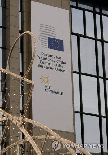 epa08924673 The logo of the Portuguese presidency of the Council of the European Union is displayed outside the European Council headquarters in Brussels, Belgium, 07 January 2021. During the first half of 2021, Portugal will have its fourth presidency of the EU Council after 1992, 2000 and 2007.