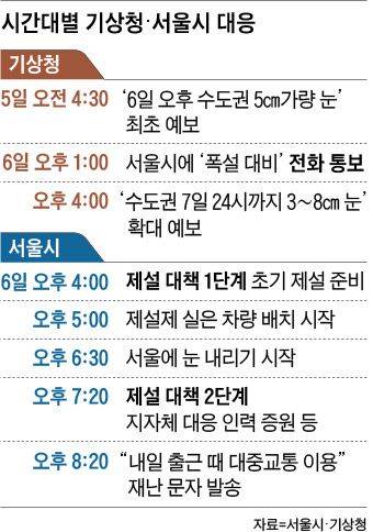 서울시는 기상청의 눈 예보가 있었음에도 제설차로 눈을 밀어내는 본격 제설은 도로를 눈이 완전 뒤덮은 뒤인 7시 20분에야 시작했다. 서울 남부 지역엔 이미 7㎝가 넘는 폭설로 도로가 아수라장이 된 상태였다. 서울시 측은 “6시 30분쯤부터 현장에 제설차가 모두 나가 있었지만 도로 정체 때문에 제대로 움직이지 못했다”며 “미리 뿌려둔 제설제도 기온이 너무 내려간 데다 눈이 갑자기 쏟아져 제 효과를 발휘하지 못했다”고 했다. 이 때문에 “서울시는 대체 제설도 안 하고 뭐하느냐”는 시민들 원성이 6~7일 이틀 내내 쏟아졌다.