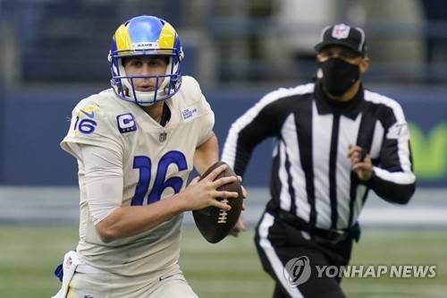 FILE - Los Angeles Rams quarterback Jared Goff (16) looks to pass against the Seattle Seahawks during the second half of an NFL football game in Seattle, in this Sunday, Dec. 27, 2020, file photo. Jared Goff is trying to return for the Los Angeles Rams' playoff game at Seattle just 13 days after thumb surgery. If he can't go, backup John Wolford will make his second NFL start. The Rams (10-6) are confident they can win with either man behind center.(AP Photo/Elaine Thompson, File) DEC. 27, 2020, FILE PHOTO