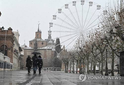 epa08924730 People walk during a snowfall in the town of Alcala de Henares, central Spain, 07 January 2020. Cold front Filomena hits almost all the country with snowfalls and temperature dropping down to 12 Celsius degrees below zero. EPA/FERNANDO VILLAR
