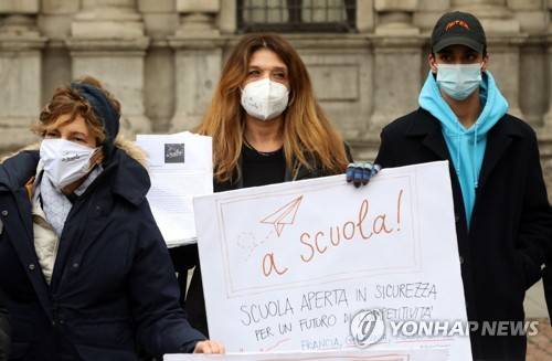 epa08924734 Students and teachers demonstrate against distance learning amid a second wave of the coronavirus disease (COVID-19) pandemic, in Milan, northern Italy, 07 January 2021. The Italian Council of Ministers decided to postpone from 07 January the return to school for high school students to 11 January. Banner in picture reading 'Back to school! School open in safety for a competitive future.'