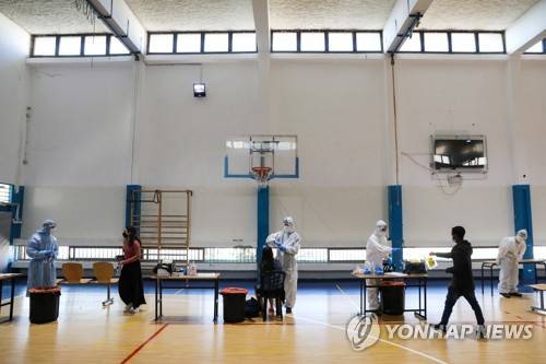 epa08924749 Israeli soldiers of the Home Front Command wearing full protective equipment collect swab samples for COVID-19 testing in a gymnasium in Jerusalem, 07 January 2021. Although Israel is one of the first countries to receive vaccines and has so far vaccinated one and a half million citizens, the rate of infection of the virus is rising drastically and Israel will enter a full closure of two weeks EPA/ABIR SULTAN