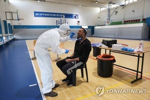 epa08924757 Israeli soldiers of the Home Front Command wearing full protective equipment collect swab samples for COVID-19 testing in a gymnasium in Jerusalem, 07 January 2021. Although Israel is one of the first countries to receive vaccines and has so far vaccinated one and a half million citizens, the rate of infection of the virus is rising drastically and Israel will enter a full closure of two weeks EPA/ABIR SULTAN
