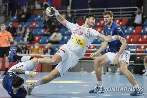 epa08924783 Abel Serdio Guntin (C) of Spain in action with Lucas Moscariello (L) and Guillermo Fischer (R) of Argentina during the handball Christmas Tournament match between Spain and Argentina in Moscow, Russia, 07 January 2021. EPA/SERGEI ILNITSKY