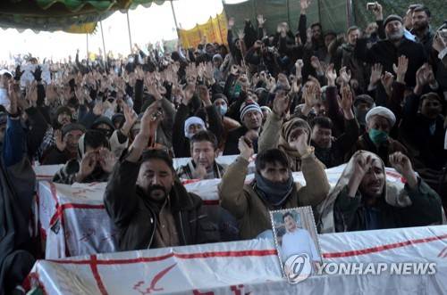 epa08924806 Members of Shiite Hazara community gather around coffins of victims as they refuse to bury them for the last five consecutive days, during a protest, on the outskirts of Quetta, Balochistan province, Pakistan, 07 January 2021. At least 11 coal miners were killed in the Mach area of Balochistan on 03 January, after armed militants kidnapped them and took them to a nearby area before opening fire at close range. EPA/JAMAL TARAQAI