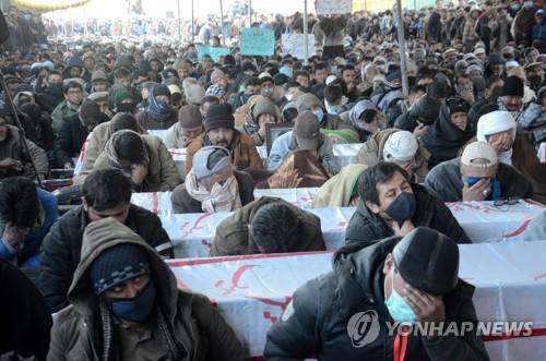 epa08924807 Members of Shiite Hazara community gather around coffins of victims as they refuse to bury them for the last five consecutive days, during a protest, on the outskirts of Quetta, Balochistan province, Pakistan, 07 January 2021. At least 11 coal miners were killed in the Mach area of Balochistan on 03 January, after armed militants kidnapped them and took them to a nearby area before opening fire at close range. EPA/JAMAL TARAQAI