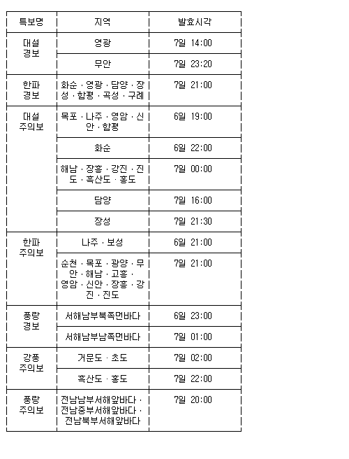 (광주=연합뉴스) 기상청은 7일 오후 11시 20분을 기해 전남 무안에 대설경보를 발효한다고 밝혔다.
