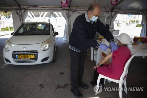 An Israeli woman receives a Pfizer COVID-19 vaccine at a drive in vaccination center in the northern Israeli city of Haifa, Thursday, Jan. 7, 2021. (AP Photo/Sebastian Scheiner)