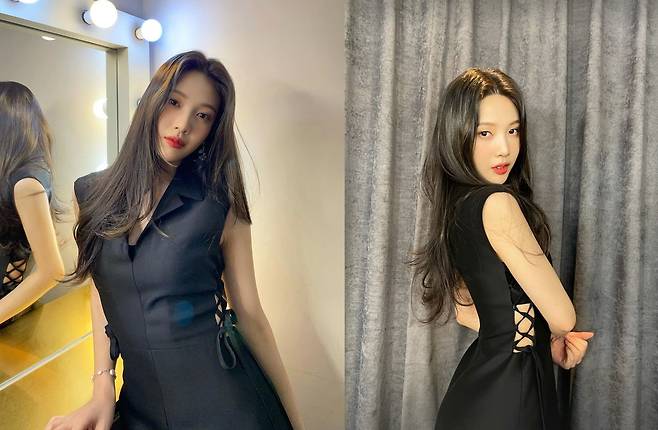 사진 속 조이는 타이트한 블랙 원피스를 입고 카메라를 응시하고 있다. 쏙 들어간 허리 라인에 있는 옆트임은 섹시미를 한층 부각시켰다.